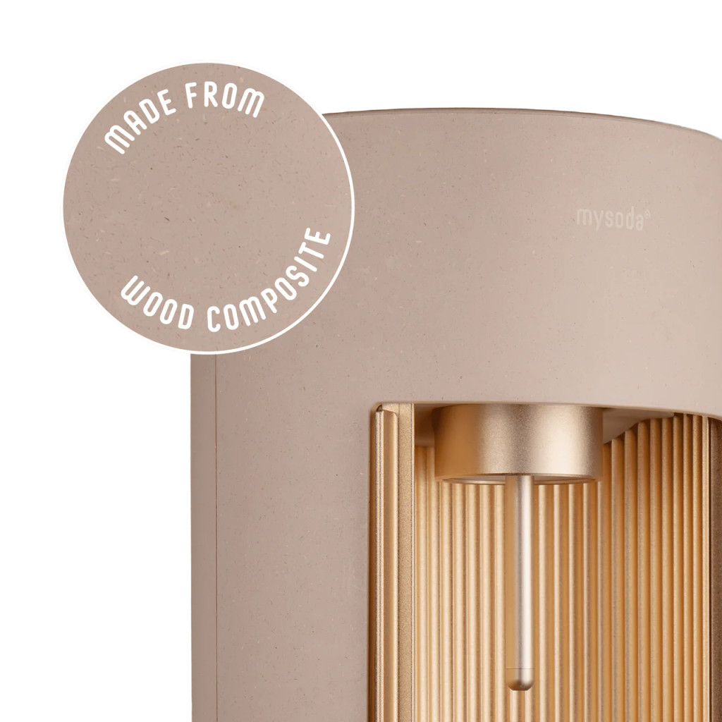 A Mysoda Glassy Szódagép a frissítő szénsavas italok szerelmeseinek tökéletes társa. A készülék egyedülálló kombinációját kínálja a fenntartható anyagoknak és a modern technológiának, hogy megfeleljen a kifinomult ízlésnek és a kényelemnek. Készült megújuló fa kompozitból és magas minőségű alumíniumból, amelynek köszönhetően nemcsak stílusos kiegészítője lehet bármely konyhának, hanem tartós és megbízható is. A matt felületén finoman látható farostok teszik egyedivé és elegánssá.